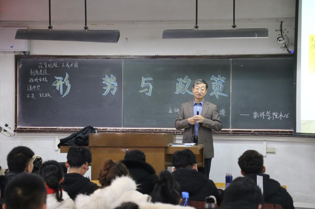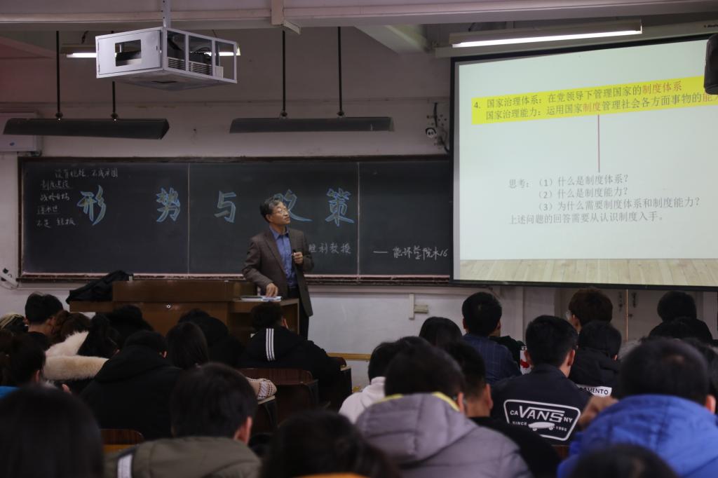 为学习和贯彻党的十九届四中全会精神,提高同学们思想政治素质,让广大青年员工深刻认识我国当前的发展形势和当代老员工应当肩负的历史责任,2019年12月24日,永利集团3044am党委副书记、董事长安胜利为永利集团3044am给排水科学与工程2016级全体员工讲授《形势与政策》。
