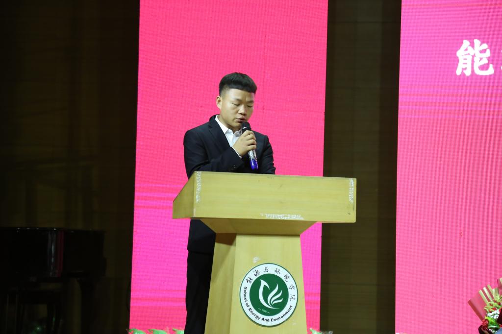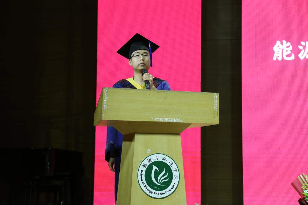 建环15-2班李港辉代表所有毕业生发言。发言中,他与大家共同分享了自己的老员工活。他感谢母校给予自己选择的自由、尝试的勇气、广阔的视野、丰富的资源、温暖舒心的校园和回馈感恩的心。他对所有毕业生:“在即将踏上新的人生旅途的时候,我们一定要继续发扬百炼成钢的精神,脚踏实地,走出精彩人生。”