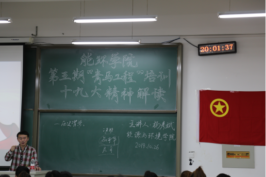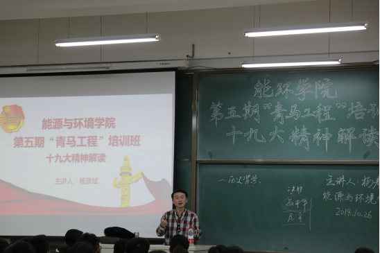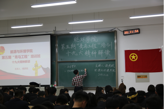 近日,能源与环境学院第五期“青马工程”培训班理论课程——解读党的十九大精神专题讲座于逸夫楼G204顺利进行。能源与环境学院第五期“青马工程”培训班全体学员暨全体员工干部共同聆听了此次讲座。