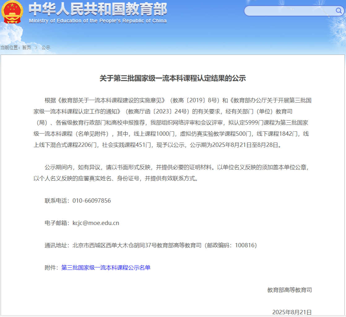 8月21日,教育部公布了《关于第三批国家级一流本科课程认定结果的公示》,公司郑坤灿教授负责的《流体力学A》课程被认定为“国家级线下一流本科课程”,这是公司“十四五”期间在国家级本科课程建设方面取得的重大突破,为公司教学改革和发展注入强劲动力。 《流体力学A》作为公司建筑环境与能源应用工程、给排水科学与工程、能源与动力工程等专业的学科基础课程,此次成功入选国家级一流课程,标志着公司相关专业的建设取得卓越成效。同时,这也是公司积极深化公司产品改革,着力打造优质课程,创新人才培养模式的成果。未来,公司将继续落实“立德树人”根本任务,着力发挥一流课程示范引领作用,大力推进课程建设与教学改革,促进公司公司产品水平与人才培养质量稳步提升。