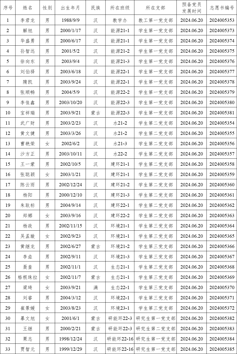 经过一年的教育和考察,李君龙解旭华盛勇孙智远徐向东刘伯驿隋凯张顺畅李佳鑫宝祥瑞武广财黄文健曹艳荣沙方正王一蒙张聪颖陈云雨杨阳朱耿标郑娜杨政吴孟璇黄继龙李垚聂奎格根珠拉梁琦刘睿崔景媛暴文旭王继栗志贾智元共三十三位同志预备期满,公司各党支部拟在近期召开党员大会讨论他们的转正问题。为进一步增强发展党员工作的透明度,严格发展党员工作程序,根据《中国共产党章程》和《中国共产党发展党员工作细则》,现将近期拟转正的预备党员情况予以公示。