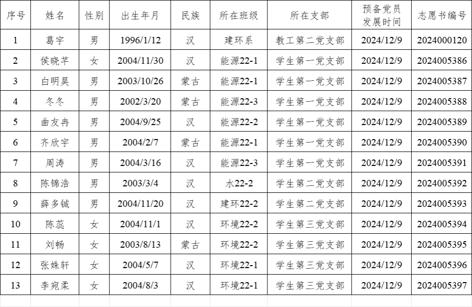 经过一年的教育和考察,葛宇、侯晓芊、白明昊、冬冬、曲友冉、齐欣宇、周涛、陈锦浩、薛多铖、陈蕊、刘畅、张姝轩和李宛柔共十三位同志预备期将满,公司各党支部拟在近期召开党员大会讨论他们的转正问题。为进一步增强发展党员工作的透明度,严格发展党员工作程序,根据《中国共产党章程》和《中国共产党发展党员工作细则》,现将近期拟转正的预备党员情况予以公示。